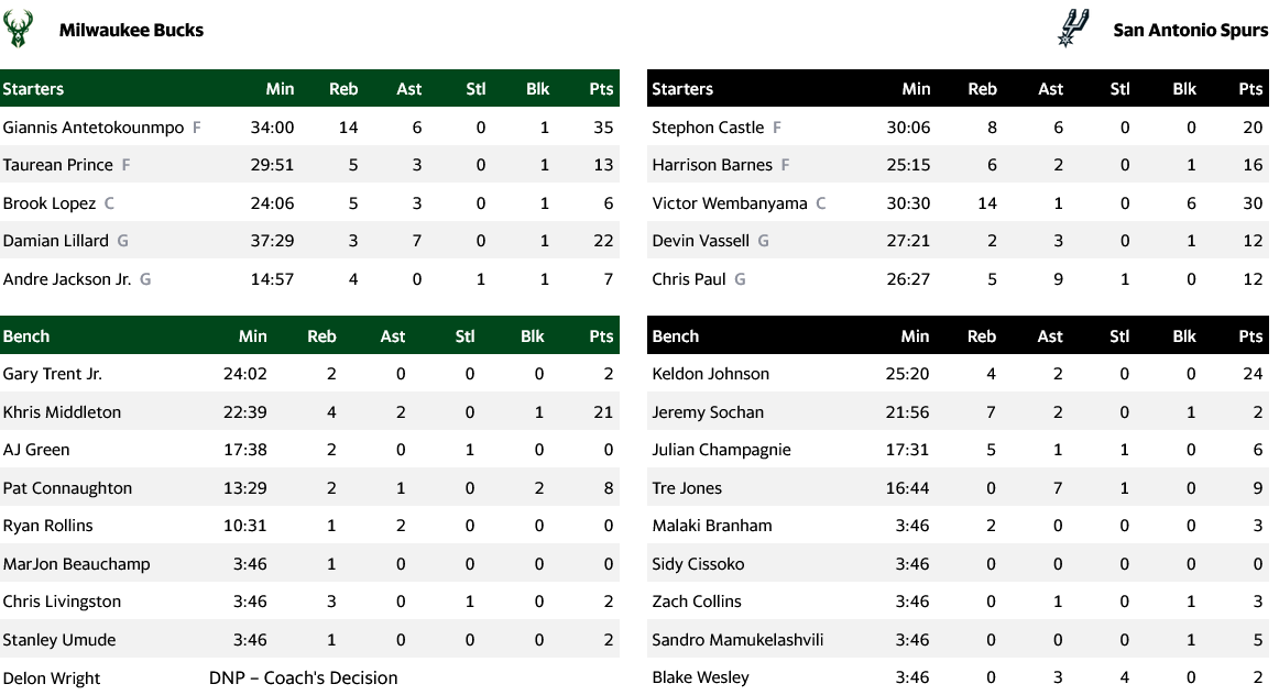 Κορυφαίος για τους νικητές ήταν ο Βίκτορ Γουεμπανιάμα, ο οποίος πέτυχε 30 πόντους, μάζεψε 14 ριμπάουντ ενώ είχε και 6 μπλοκ σε μια κυριαρχική εμφάνιση, με συμπαραστάτες τους Κέλντον Τζόνσον (24π, 4ρ) και Στεφόν Καστλ (20π, 8ρ, 6ασ). Από τους Μπακς, ο Γιάννης Αντετοκούνμπο ήταν αυτός που ξεχώρισε με 35 πόντους και 14 ριμπάουντ, με τον Ντέιμιαν Λίλαρντ να προσθέτει 22.