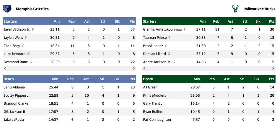 Το αποτέλεσμα αυτό ανεβάζει το Μέμφις στη 2η θέση της Δυτικής περιφέρειας με ρεκόρ 33 νικών και 16 ηττών, ενώ το Μιλγουόκι με 26-21 υποχώρησε στη 5η θέση της Ανατολής.