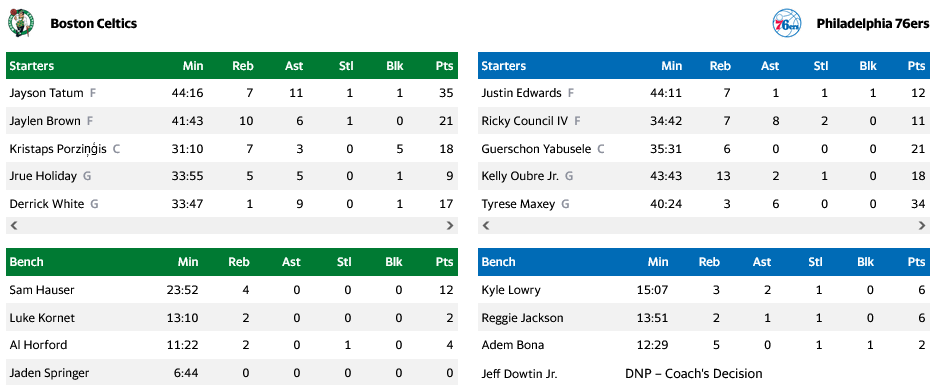 Το αποτέλεσμα αυτό διατηρεί τη Βοστόνη στη 2η θέση της Ανατολής με 35-15, ενώ η Φιλαδέλφεια παρέμεινε στην 11η θέση με ρεκόρ 19-29.