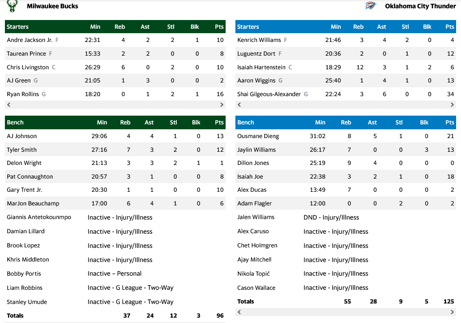 Οι Μπακς αγωνίστηκαν με τα «δεύτερα» στην Οκλαχόμα, καθώς οι Γιάννης Αντετοκούνμπο, Ντέμιαν Λίλαρντ, Μπρουκ Λόπεζ, Κρις Μίντλετον και Μπόμπι Πόρτις είδαν το παιχνίδι από την τηλεόραση, κάτι που εκμεταλλεύτηκαν οι Θάντερ, συντρίβοντας τα «ελάφια» με 125-96.