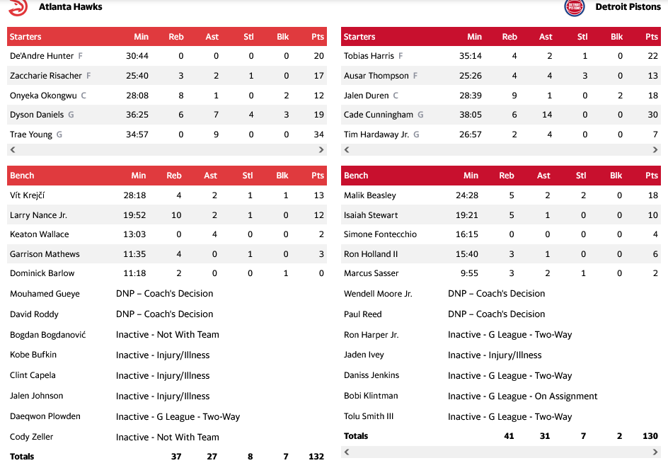 Ματσάρα είχαμε στο Ντιτρόιτ, με τους Χοκς να επικρατούν των Πϊστονς με 132-130, χάρη σε καλάθι του Τρέι Γιανγκ στο φινάλε της αναμέτρησης, με τον ηγέτη της Ατλάντα να τελειώνει το ματς με 34 πόντους και εννέα ασίστ. 19 πόντους πέτυχε ο Ντάνιελς και 17 ο Ρισασέ.