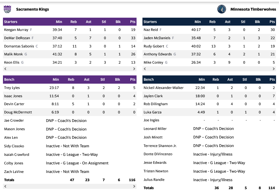 Θρίλερ είχαμε και στην Μινεσότα, με τους Κινγκς να επικρατούν των Τίμπεργουλβς με 116-114. Εκπληκτικός ο ΝτεΡόζαν με 33 πόντους, με τον Μονκ να έχει 26 και τον Σαμπόνις 14 πόντους και 11 ριμπάουντ.
