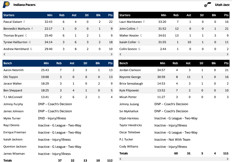 Για την Γιούτα, ο Κόλινς είχε 21 πόντους και 12 ριμπάουντ, με τον Κλάρκσον να έχει 21 πόντους και του Μάρκανεν και Τζορτζ από 16 έκαστος.