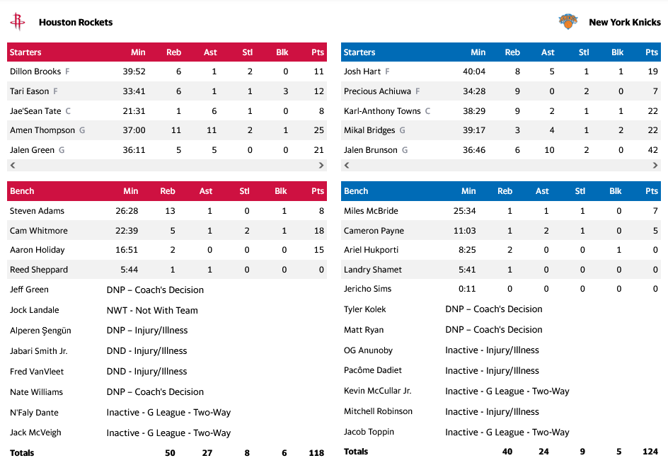 Ο ηγέτης της Νέας Υόρκης ήταν απολαυστικός, πετυχαίνοντας 42 πόντους, τους 17 στην τελευταία περίοδο, έχοχντας και 10 ασίστ. Από 22 πόντους σημείωσαν οι Τάουνς και Μπρίτζες, ενώ ο Χαρτ σταμάτησε στους 19 πόντους.