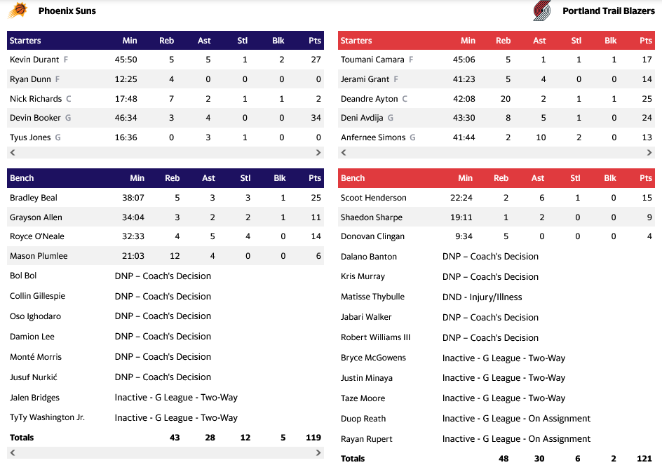 Για το Φοίνιξ, ο Μπούκερ είχε 34 πόντους, ο Ντουράντ 27 και ο Μπιλ 25, ενώ ο Ο’ Νλιλ πέτυχε 14 πόντους, ανάμεσα τους το τρίποντο που οδήγησε το ματς στην παράταση.
