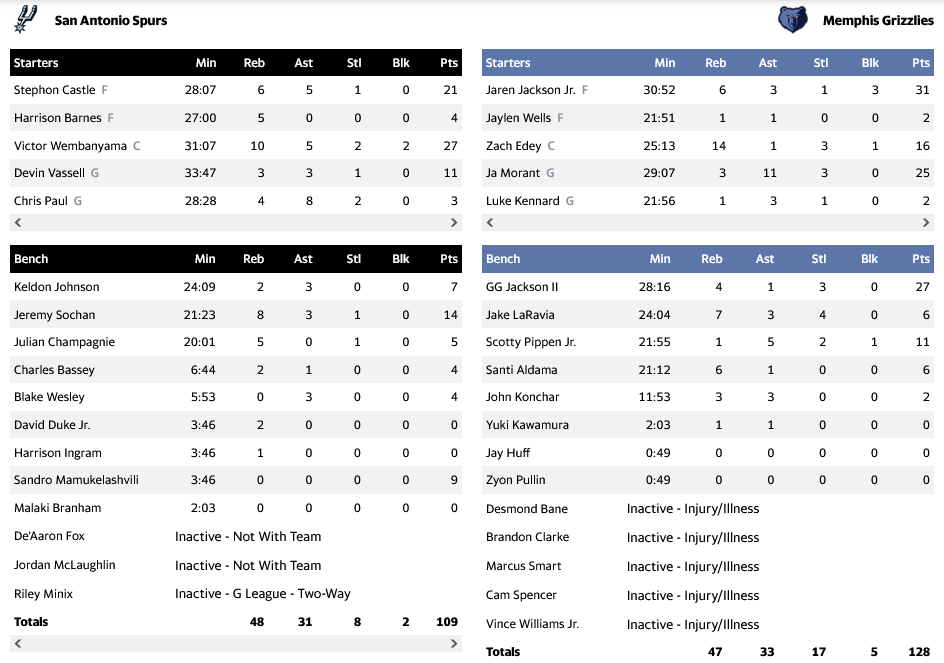 Σημαντική νίκη για τους Γκρίζλις, που δεν… ψάρωσαν μπροστά στο «φαινόμενο» Γουεμπανιαμά, επικρατώντας με άνεση των Σπερς, όπως δείχνει το τελικό 128-109.