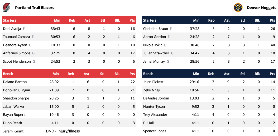 Με το αποτέλεσμα αυτό, το Ντένβερ βρίσκεται στη 3η θέση της Δυτικής Περιφέρειας με ρεκόρ 35-19, ενώ από την άλλη πλευρά το Πόρτλαντ είναι στη 13η θέση με 23 νίκες και 31 ήττες.