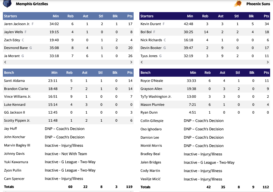 Για τους Σανς, ο Ντουράντ έγραψε ιστορία, καθώς με τους 34 πόντους που πέτυχε, ξεπέρασε τους 30.000 πόντους στην καριέρα του στο ΝΒΑ. Από εκεί και πέρα, ο Μπολ έκανε double – double με 18 πόντους και 14 ριμπάουντ και ο Μπούκερ είχε 17 πόντους και εννέα ασίστ.