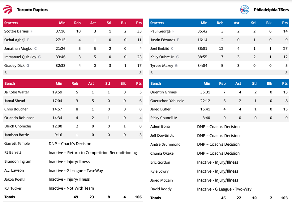 Για τους Σίξερς, ο Εμπίντ είχε 27 πόντους και 12 ριμπάουντ, με τον Μπάτλερ να προσθέτει 15 πόντους και τον Τζορτζ να έχει 14.