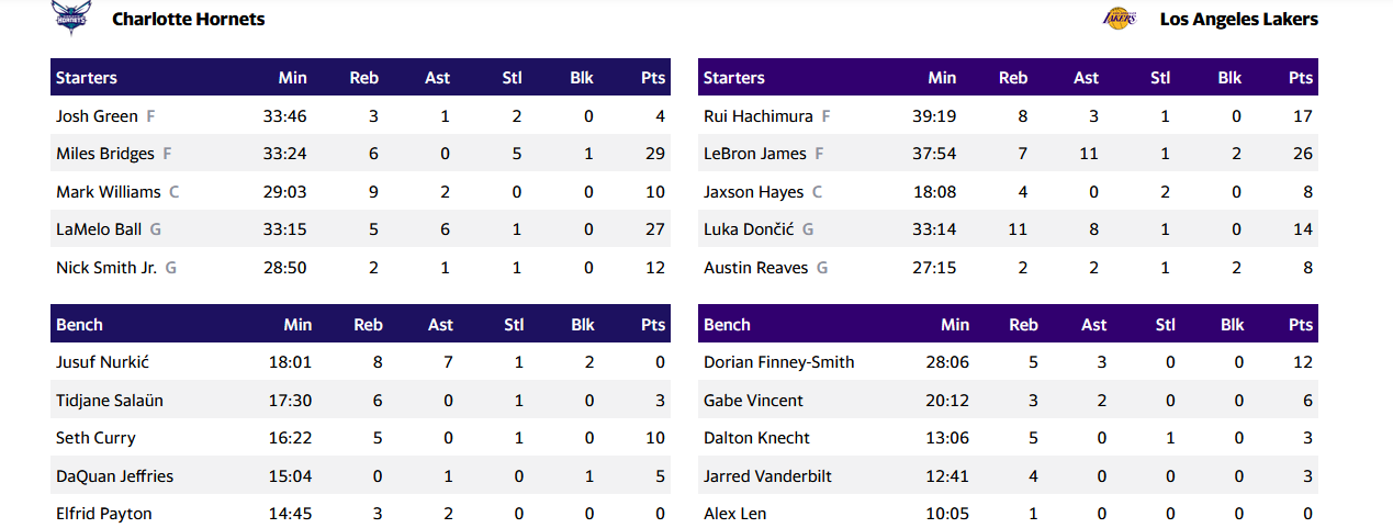 Από την άλλη, από την ομάδα του Λος Άντζελες ξεχώρισαν ο Λεμπρόν Τζέιμς με 26 πόντους, 7 ριμπάουντ και 11 ασίστ, ακολουθεί ο Χακιμούρα με 17 πόντους και 8 ριμπάουντ, ενώ πολύ καλή επίδοση είχε και ο Ντόντσιτς, ο οποίος σημείωσε 14 πόντους, 11 ριμπάουντ και 8 ασίστ.
