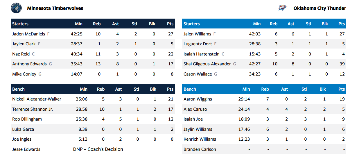 Από την άλλη, εκπληκτικός ήταν ο Σάι Γκίλτζεους-Αλεξάντερ με 39 πόντους, 10 ριμπάουντ και 8 ασίστ, ενώ με μεγάλη διαφορά ακολουθεί ο Τζέιλεν Γουίλιαμς με 27 πόντους και 6 ριμπάουντ και ασίστ αντίστοιχα.