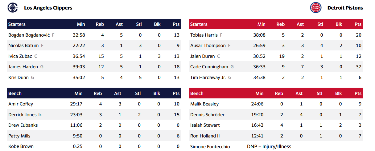 Από τους Λος Άντελες Κλίπερς, ο Τζέιμς Χάρντεν πέτυχε 18 πόντους, 12 ριμπάουντ και 5 ασίστ και ο Ντέρικ Τζόουνς σημείωσε 15 πόντους και 3 ριμπάουντ.