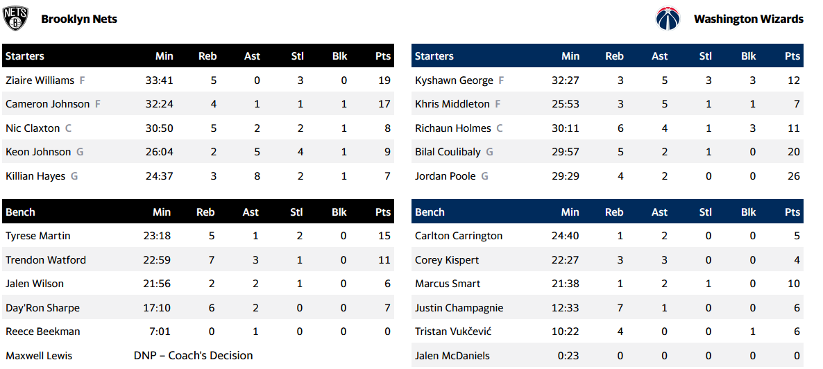 Από τους Νετς ξεχώρισαν οι Γουίλιαμς με 19 πόντους και 5 ριμπάουντ και Κάμερον Τζόνσον με 17 πόντους και 4 ριμπάουντ.