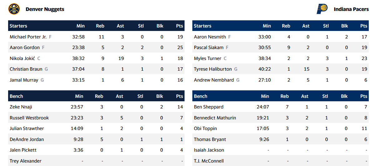 Από τους Πέισερς ξεχώρισαν ο Μάιλς Τέρνερ με 23 πόντους και από 2 ριμπάουντ και ασίστ και ακολουθούν οι Πασκάλ Σιακάμ και Ταϊρίζ Χάλιμπέρτον με 19 πόντους έκαστος, ενώ ο πρώτος μάζεψε 9 ριμπάουντ και ο δεύτερος μοίρασε 15 ασίστ.