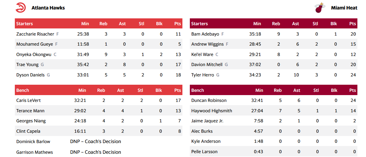 Ξεχώρισε και πάλι ο Τάιλερ Χίροου από τους Χιτ , ο οποίος πέτυχε 24 πόντους, 2 ριμπάουντ και 10 ασίστ, ενώ ακολουθεί ο Μπαμ Αμπεμπάγιο με 20 πόντους, 9 ριμπάουντ και 3 ασίστ.