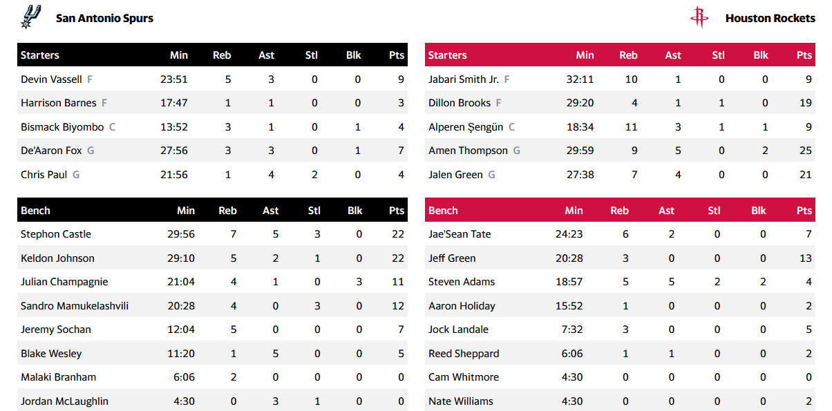 Aπό τους νικητές ξεχώρισαν ο Άμεν Τόμσον με 25 πόντους, 9 ριμπάουντ και 5 ασίστ, καθώς και ο Τζέιλεν Γκριν με 21 πόντους, 7 ριμπράουντ και 4 ασίστ.