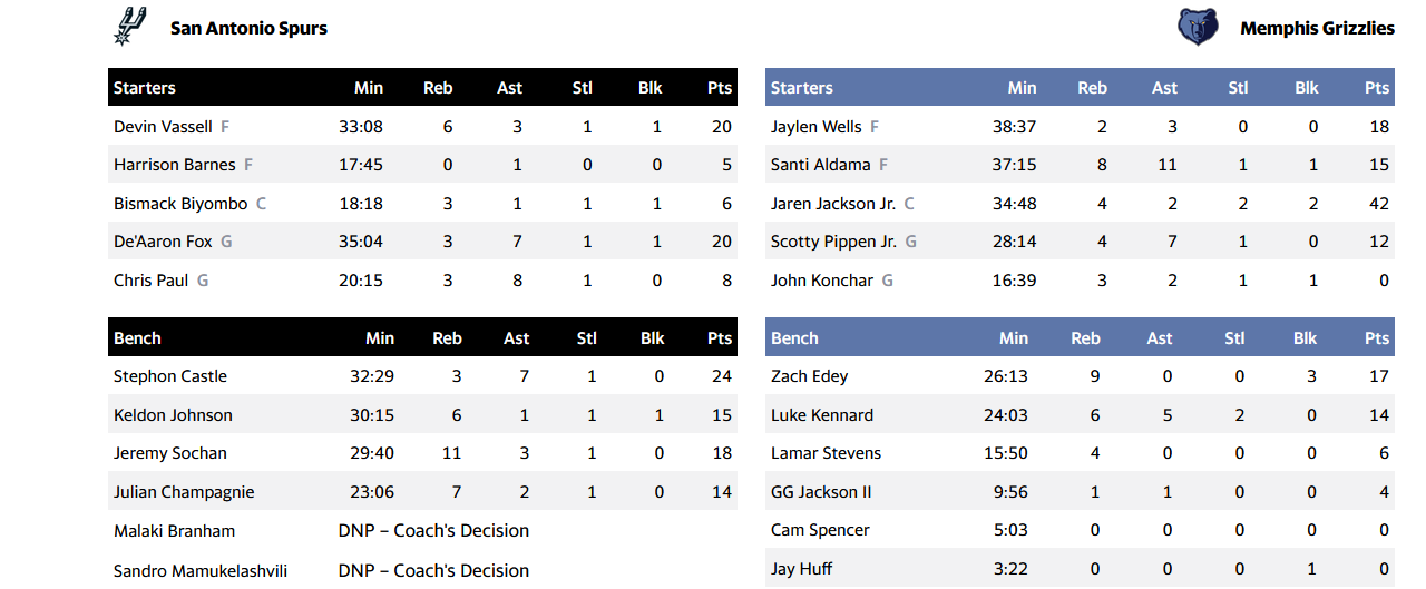 Από την άλλη, από τους Μέμφις Γκρίζλις πρωταγωνιστής ήταν ο Τζάρεν Τζάκσον Τζούνιορ που έφτασε τους 42 πόντους και ακολουθεί με μεγάλη διαφορά ο Τζέιλεν Γουέλς με 18 πόντους και 3 ασίστ.