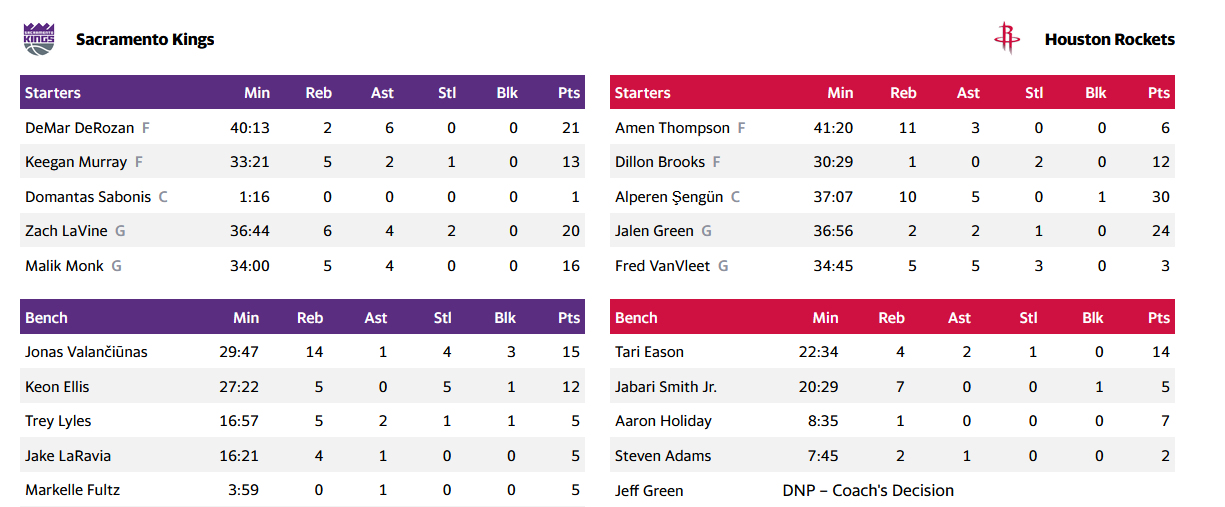 Αποτελεσματικοί για τους Σακραμέντο Κινγκς ήταν ο ΝτιΜαρ ΝτιΡόζαν με 21 πόντους και 6 ασίστ και ο Ζακ ΛαΒιν με 20 πόντους, 6 ριμπάουντ και 4 ασίστ.