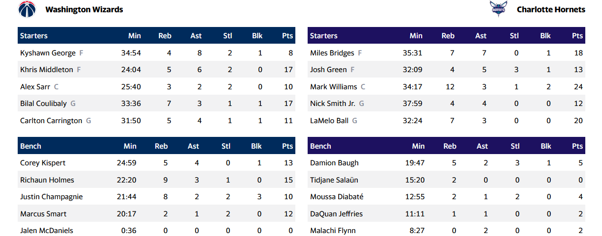Από τους Γουίζαρντς ξεχώρισε ο Κρις Μίντλετον με 17 πόντους, 5 ριμπάουντ και 6 ασίστ, καθώς και ο Μπιλάλ Κουλίμπαλι με επίσης 17 πόντους, 7 ριμπάουντ και 3 ασίστ.