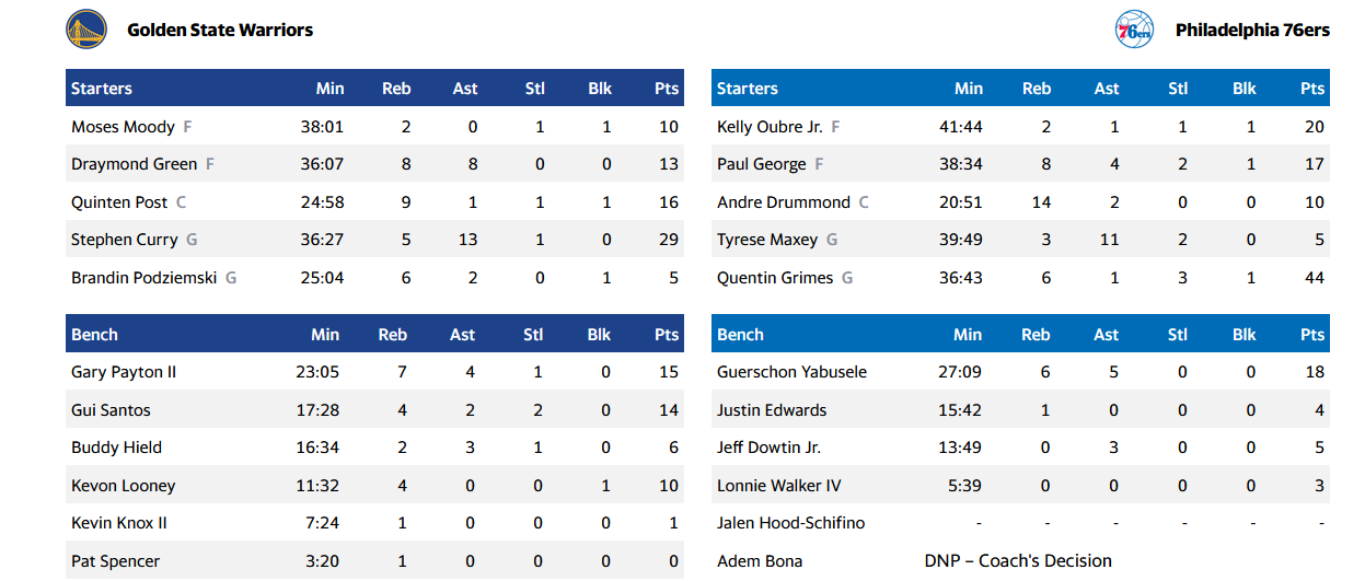 Τα ξημερώματα της Κυριακής (2/3) οι Γκόλντεν Στέιτ Γουόριορς αντιμετώπισαν τους Φιλαδέλφια 76ερς σε μία πολύ δυνατή αναμέτρηση, από την οποία δεν μπόρεσαν να βγουν νικητές και οι Σίξερς θριάμβευσαν με 119-126.