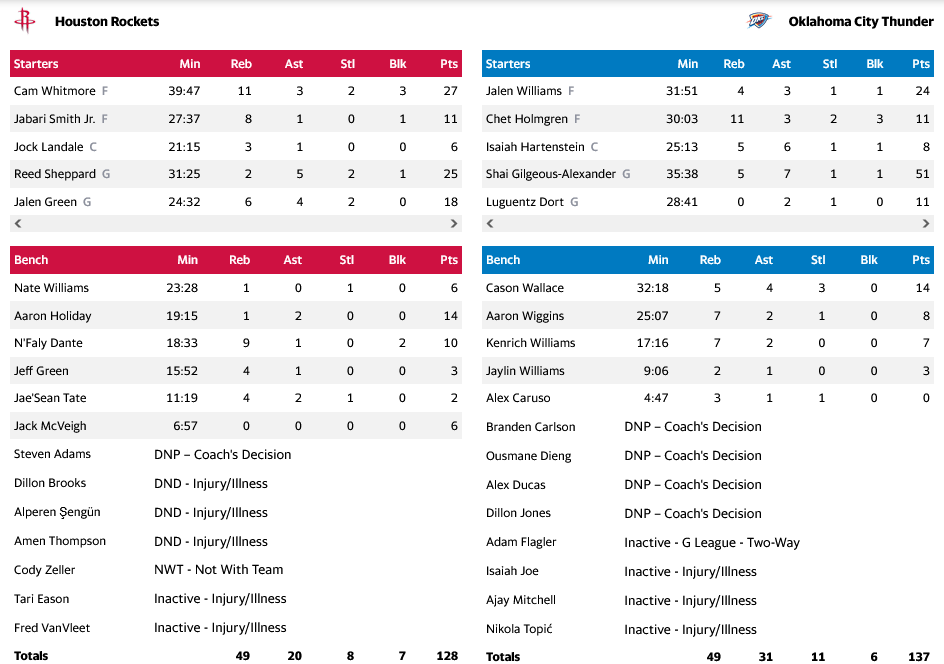 Για τους Ρόκετς, που αγωνίστηκαν χωρίς τους Σενγκούν, ΒανΒλίτ, Τόμπσον και Ίσον, ο Γουίτμορ είχε 27 πόντους και 11 ριμπάουντ , ο Σέπαρντ 25 πόντους και ο Γκριν 18.