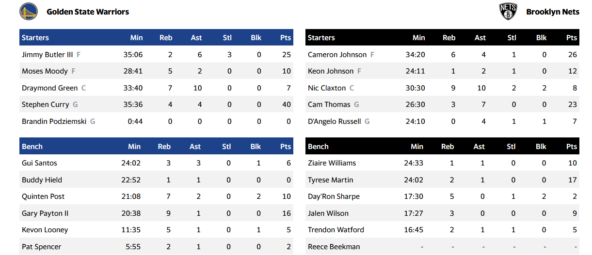 Από τους νικητές, με 40 πόντους ξεχώρισε ο Κάρι, ενώ πέτυχε και από 4 ριμπάουντ και ασίστ, καθώς και ο Τζίμι Μπάτλερ με 25 πόντους και 6 ριμπάουντ.