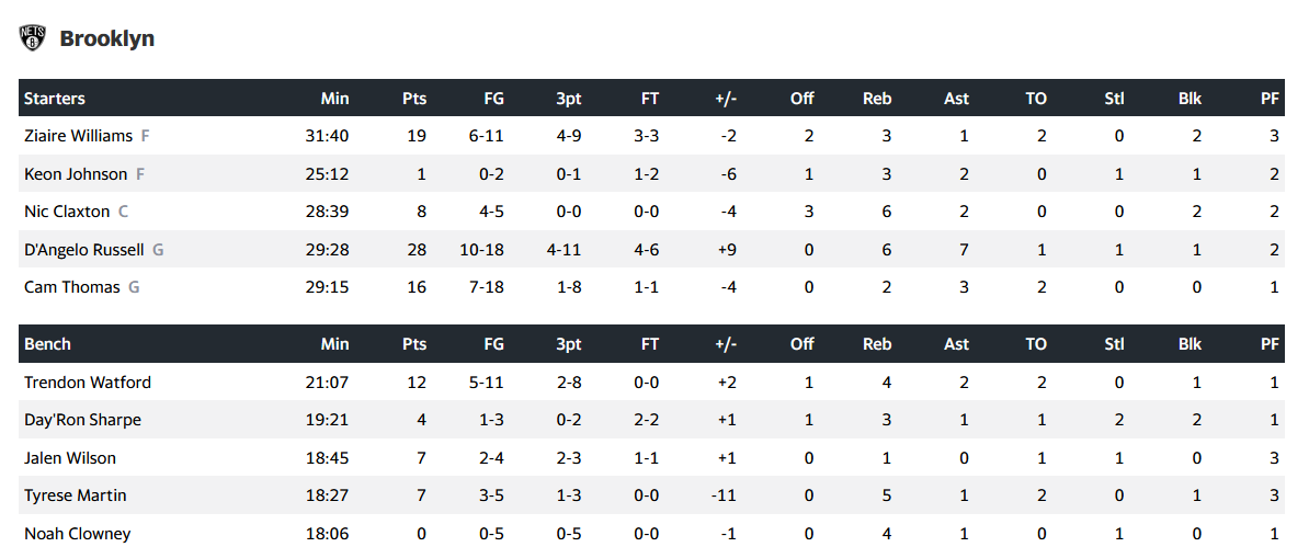 Από το Μπρούκλιν ξεχώρισε ο ΝτΆντζελο Ράσελ με 28 πόντους, 7 ασίστ και 6 ριμπάουντ, καθώς και ο Ζιέρ Γουίλιαμς με 22 πόντους και 3 ριμπάουντ.