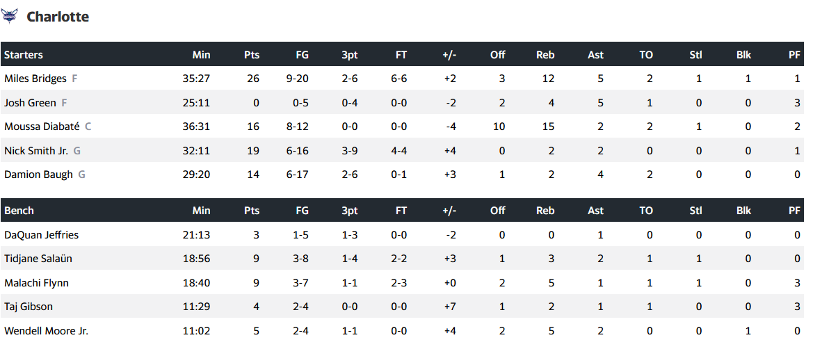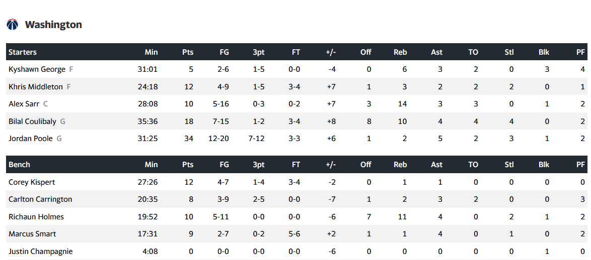 Από τους Γουίζαρντς ξεχώρισαν οι Τζόρνταν Πόουλ με 34 πόντους και 5 ασίστ και Μπιλάλ Κουλιμπάλι με 18 πόντους, 10 ριμπάουντ και 4 ασίστ.