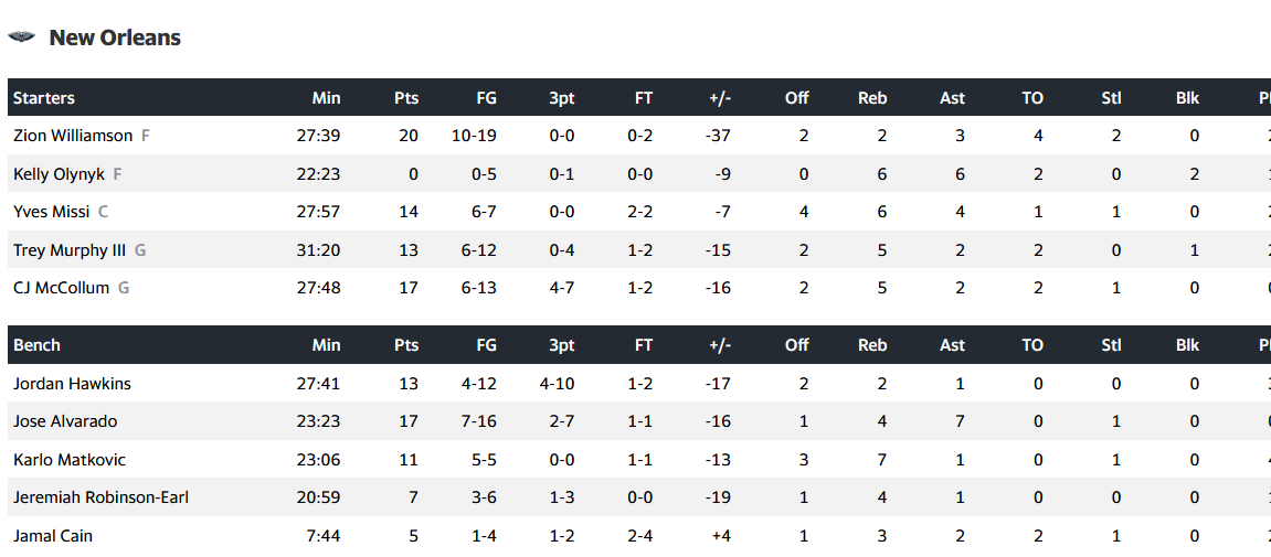 Από την ομάδα της Νέας Ορλεάνης ξεχώρισε ο ΣιΤζέι ΜακΚόλουμ με 17 πόντους και 5 ριμπάουντ και ο Χοσέ Αλβαράδο με επίσης 17 πόντους, 7 ασίστ και 4 ριμπάουντ.