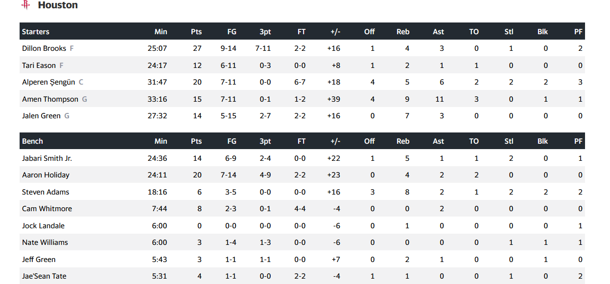 Από τους νικητές, πολύ καλή επίδοση πραγματοποίησε ο Ντίλον Μπρουκς που σημείωσε 27 πόντους και 4 ριμπάουντ, καθώς και ο Άμεν Τόμπσον με 15 πόντους, 11 ασίστ και 9 ριμπάουντ.