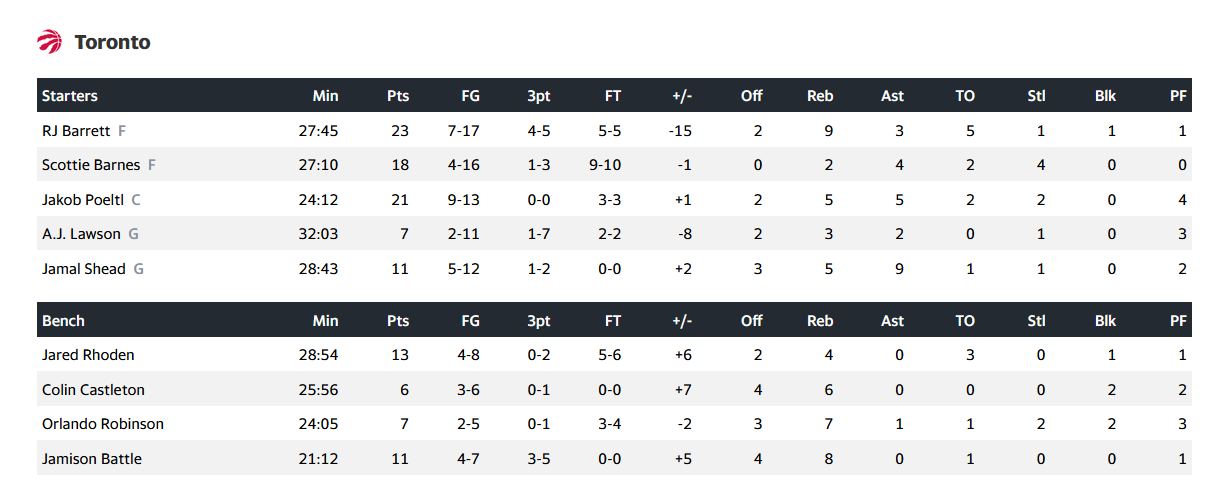 Καλή επίδοση από το Τορόντο σημείωσε ο Αρ Τζέι Μπάρετ με 23 πόντους και 9 ριμπάουντ, ενώ ακολουθεί ο Τζέικομπ Πελτλ με 21 πόντους και από 5 ασίστ και ριμπάουντ.