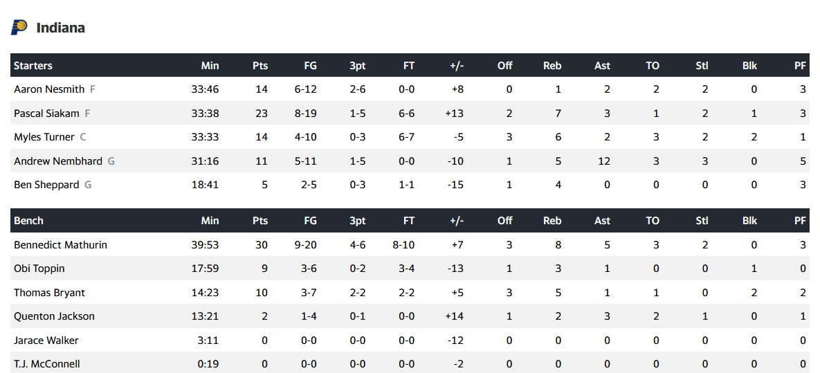 Από τους Πέισερς, ξεχώρισε ο Μπένεντικτ Μάθουριν με 30 πόντους, 8 ριμπάουντ και 5 ασίστ, καθώς και ο Πασκάλ Σιάκαμ με 23 πόντους και 7 ριμπάουντ.