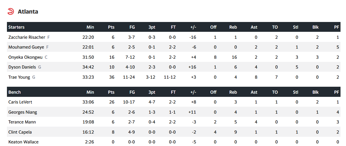 Από την άλλη, από τους νικητές πολύ καλή εμφάνιση πραγματοποίησε ο Τρέι Γιάνγκ με 36 πόντους, 8 ασίστ και 4 ριμπάουντ, ενώ ακολουθεί ο Ονιέκα Οκόνγκου με 16 πόντους και 16 ριμπάουντ.