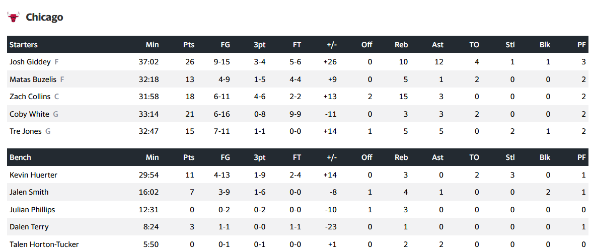 Από τους Ταύρους, κορυφαίος ήταν ο Τζος Γκιντέι με 26 πόντους, 12 ασίστ και 10 ριμπάουντ, ενώ ακολουθεί ο Ζακ Κόλινς με 18 πόντους και 15 ριμπάουντ.