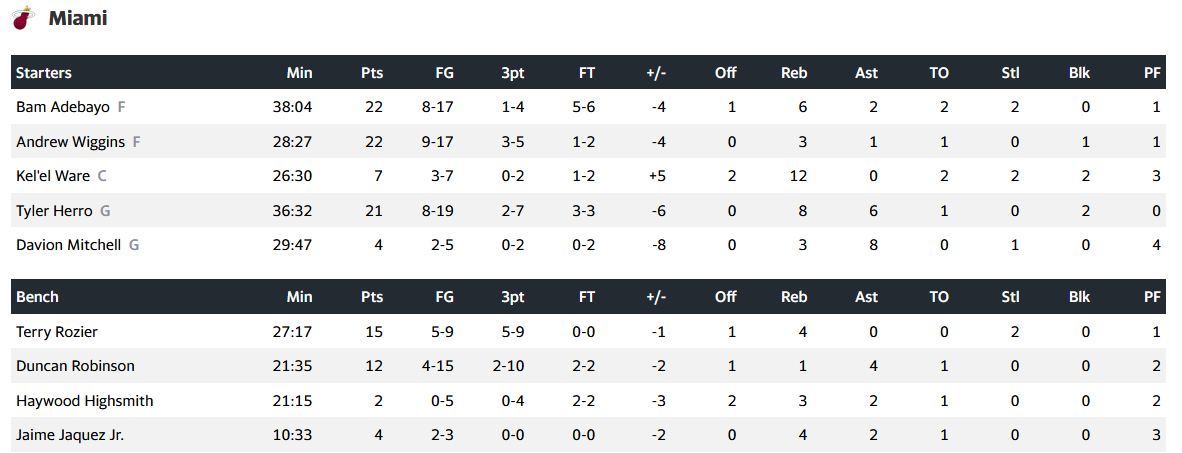 Πρωταγωνιστής από το Μαϊάμι ήταν ο Μπαμ Αμπεμπάγιο με 22 πόντους και 6 ριμπάουντ, καθώς και ο Τάιλερ Χίροου που πέτυχε 21 πόντους, 8 ριμπάουντ και 6 ασίστ.