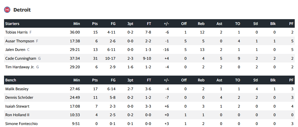 Από το Ντιτρόιτ ξεχώρισε ο Κέιντ Κούνινχαμ με 31 πόντους, 5 ασίστ και 4 ριμπάουντ, ενώ ακολουθεί ο Μάλικ Μπίζλεϊ με 17 πόντους.