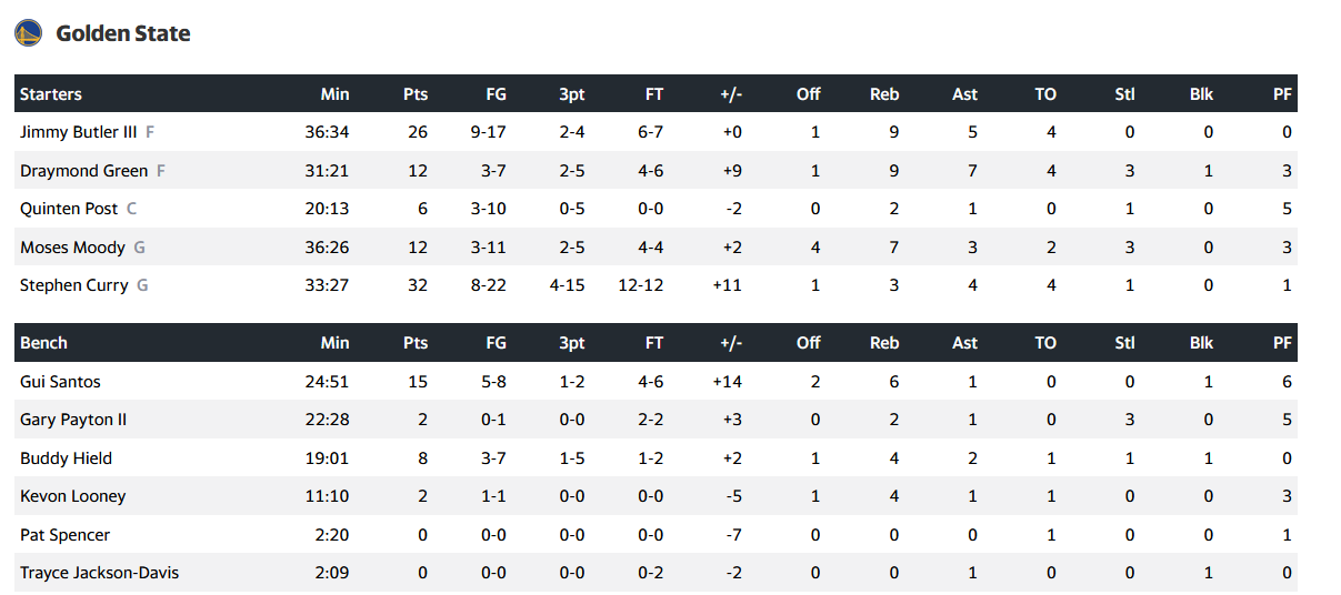 Από τους νικητές, κορυφαίος ήταν ο Στέφεν Κάρι με 32 πόντους, 4 ασίστ και 3 ριμπάουντ, καθώς και ο Τζίμι Μπάτλερ με 26 πόντους, 9 ριμπάουντ και 5 ασίστ.