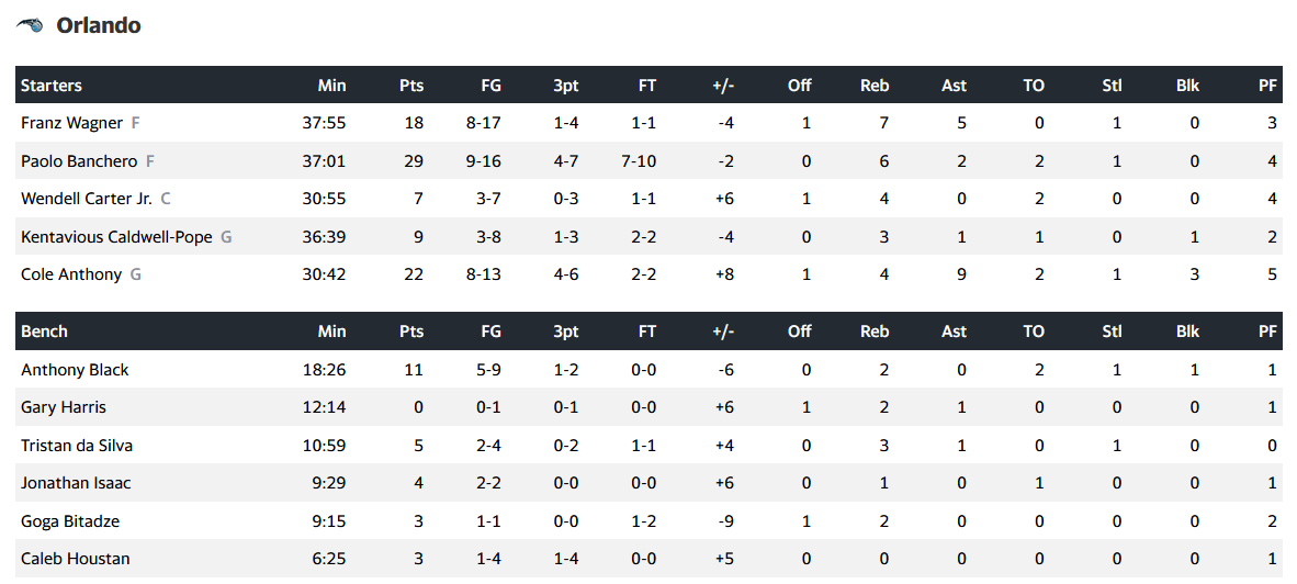 Από τους νικητές ξεχώρισε ο Πάολο Μπανκέρο με 29 πόντους και 6 ριμπάουντ, καθώς και ο Κόουλ Άντονι που σημείωσε 22 πόντους, 9 ασίστ και 4 ριμπάουντ.
