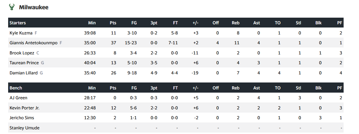 Από τα Ελάφια, εκπληκτικός ο Greek Freak με 37 πόντους, 11 ριμπάουντ και 4 ασίστ, ενώ ακολουθεί ο Ντάμιαν Λίλαρντ με 26 πόντους, 7 ριμπάουντ και 4 ασίστ.