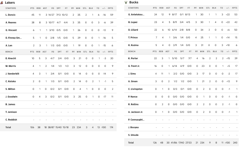 Για τους Λέικερς καταπληκτικός ήταν ο Ντόνσιτς με 45 πόντους και 11 ριμπάουντ και ακολούθησε ο Ριβς με 28 πόντους.