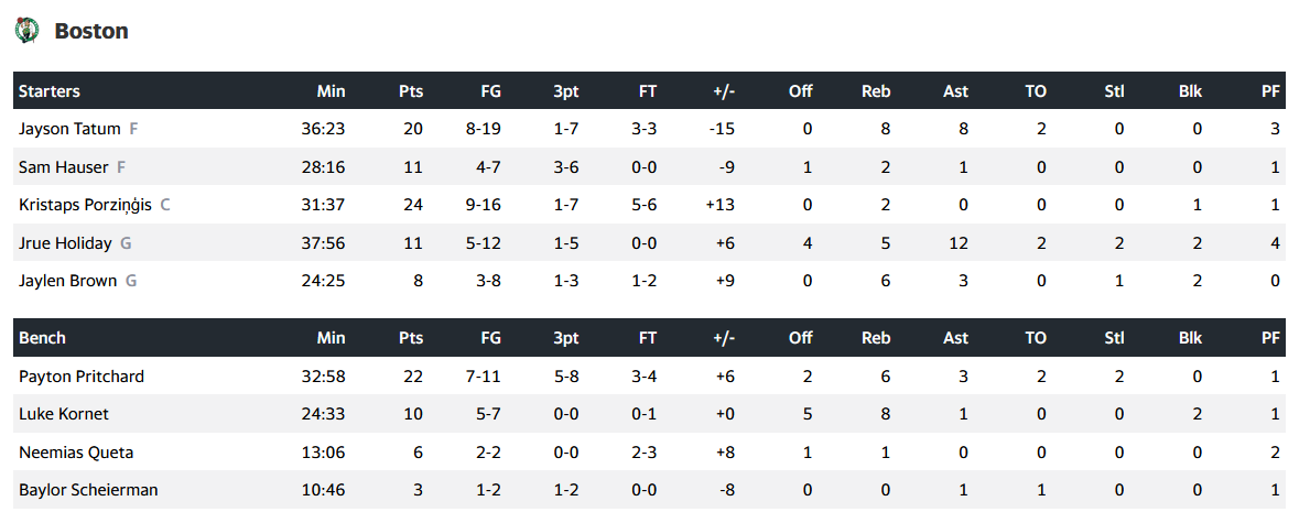 Από τους νικητές ξεχώρισαν ο Τζέισον Τέιτουμ με 20 πόντους και από 8 ασίστ και ριμπάουντ, καθώς και ο Τζρου Χόλιντεϊ με 11 πόντους, 12 ασίστ και 5 ριμπάουντ.