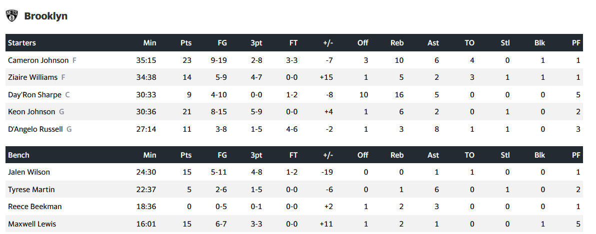 Από την ομάδα του Μπρούκλιν, πολύ καλή επίδοση σημείωσε ο Κάμερον Τζόνσον με 23 πόντους, 10 ριμπάουντ και 6 ασίστ, ενώ ακολουθεί ο ΝτέιΡον Σαρπ με 9 πόντους, 16 ριμπάουντ και 5 ασίστ.