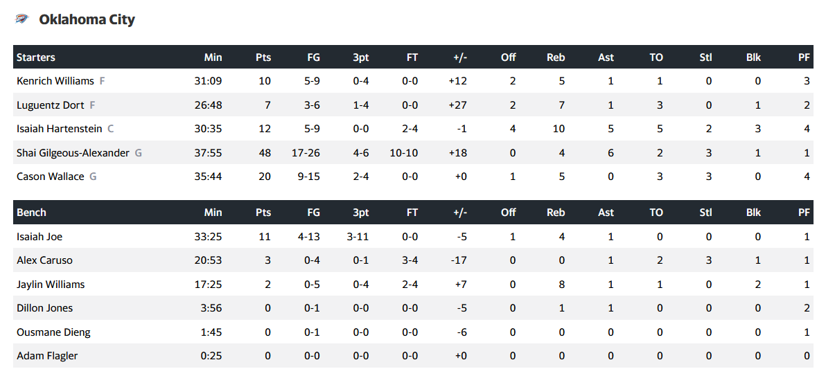 Απίστευτος Σάι Γκίλτζεους-Αλεξάντερ με 48 πόντους, 6 ασίστ και 4 ριμπάουντ, ενώ ακολουθεί ο Ιζάια Χάρτενστεϊν με 12 πόντους, 10 ριμπάουντ και 5 ασίστ.