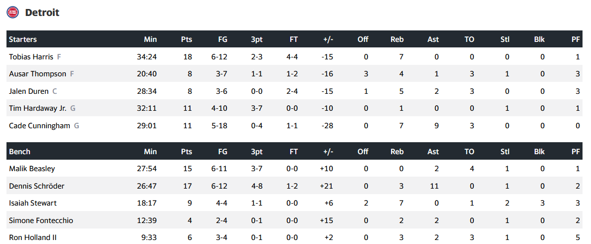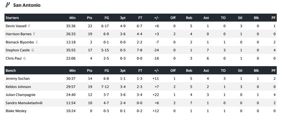 Από την άλλη καλή ήταν η επίδοση του Ντέβιν Βασέλ που πέτυχε 22 πόντους και 5 ριμπάουντ, καθώς και του Στέφον Καστλ που σημείωσε 17 πόντους και 7 ασίστ.