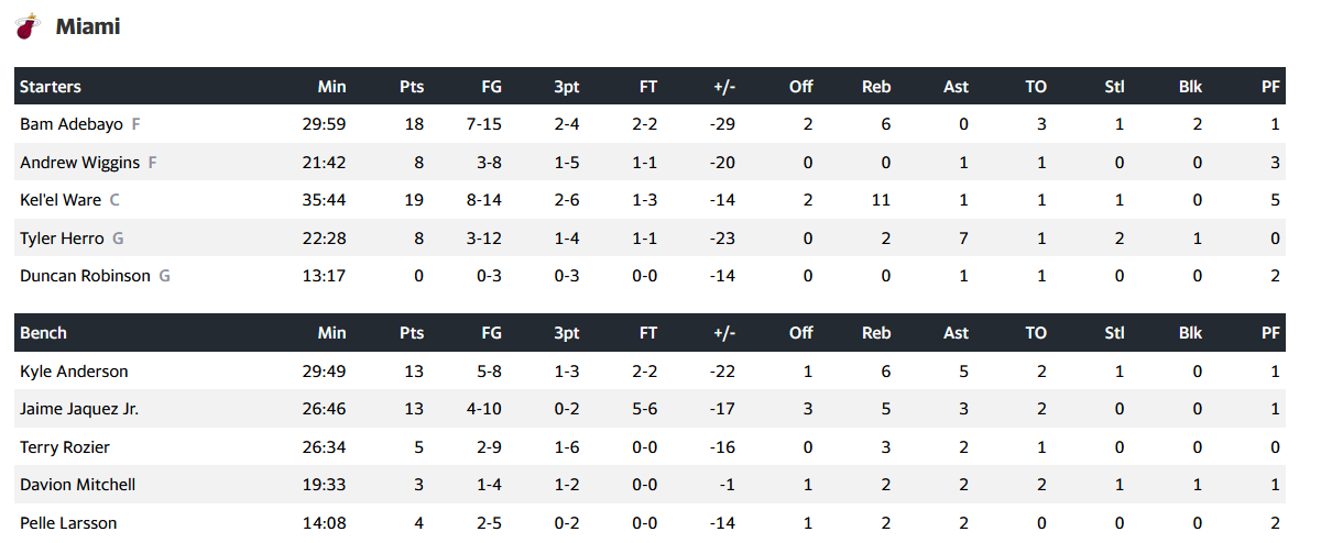 Από το Μαϊάμι πολύ καλός ήταν ο Κέλ΄ ελ Γουέρ με 19 πόντους και 11 ριμπάουντ, καθώς και ο Μπαμ Αμπεμπάγιο με 18 πόντους και 6 ριμπάουντ.