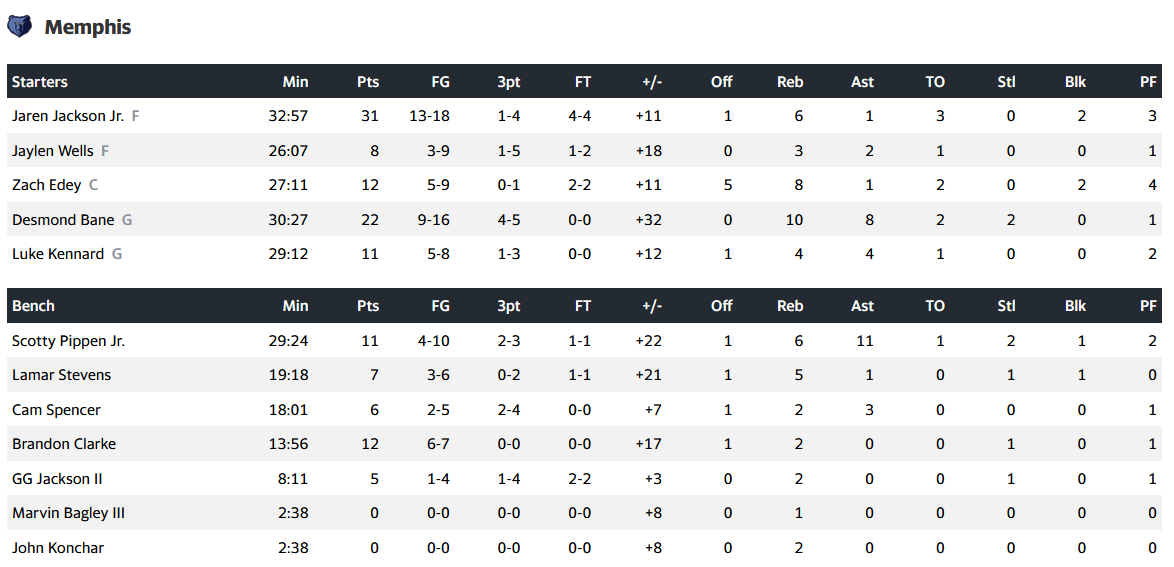 Από τους νικητές ξεχώρισε με 31 πόντους και 6 ριμπάουντ ο Τζάρεν Τζάκσον Τζούνιορ, ενώ ακολουθεί ο Ντίζμοντ Μπέιν με 22 πόντους, 10 ριμπάουντ και 8 ασίστ.