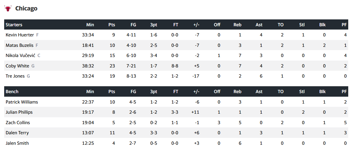 Πολύ καλός από τους Ταύρους ο Κόντι Γουάιτ, που πέτυχε 23 πόντους, 7 ριμπάουντ και 4 ασίστ, καθώς και ο Τρι Τζόουνς με 19 πόντους και 6 ασίστ.