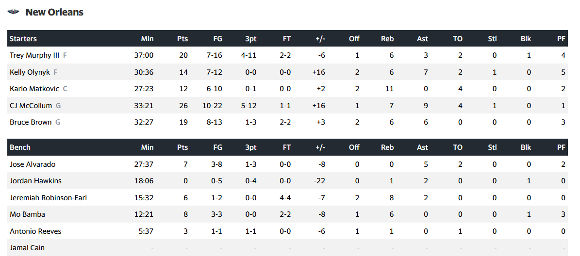 Από την ομάδα της Νέας Ορλεάνης ξεχώρισε ο Σι Τζέι ΜακΚόλουμ που σημείωσε 26 πόντους, 9 ασίστ και 7 ριμπάουντ και ο Τρέι Μέρφι με 20 πόντους και 6 ριμπάουντ.