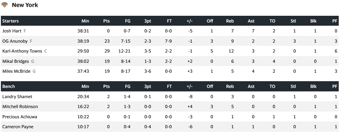 Από τους Νικς ξεχώρισε ο Καρλ-Άντονι Τάουνς με 29 πόντους και 12 ριμπάουντ, καθώς και ο Όου Τζι Ανουνόμπι με 23 πόντους και 9 ριμπάουντ.