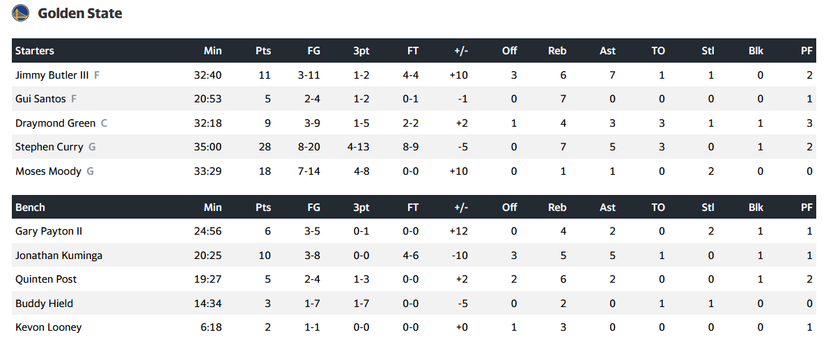 Από την ομάδα των νικητών, πολύ καλή επίδοση πραγματοποίησε ο Στέφεν Κάρι με 28 πόντους, 7 ριμπάουντ και 5 ασίστ, ενώ ακολουθεί ο Μόουζες Μούντι με 18 πόντους.